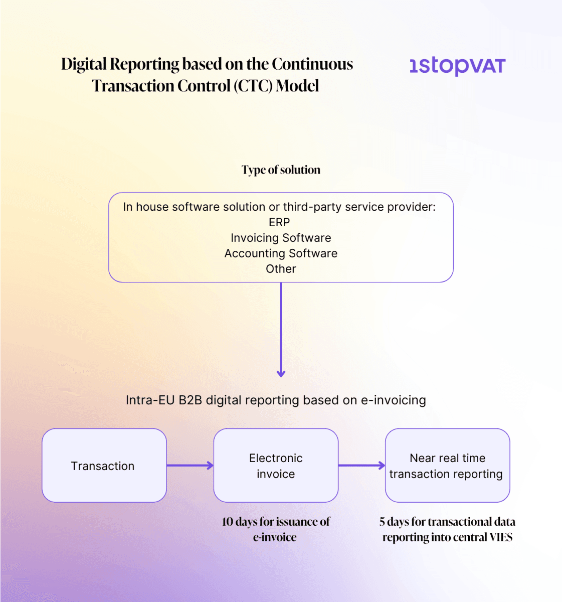 Introducing a digital reporting system that should cover all intra-EU B2B transactions is, technically and from the investment perspective, a most demanding part of the ViDA puzzle. It encompasses a shift to digital VAT reporting and structured e-invoicing across the entire EU by July 2030. In the scheme below, you can get familiar with the basic overview of how the proposed DRR regime should work: